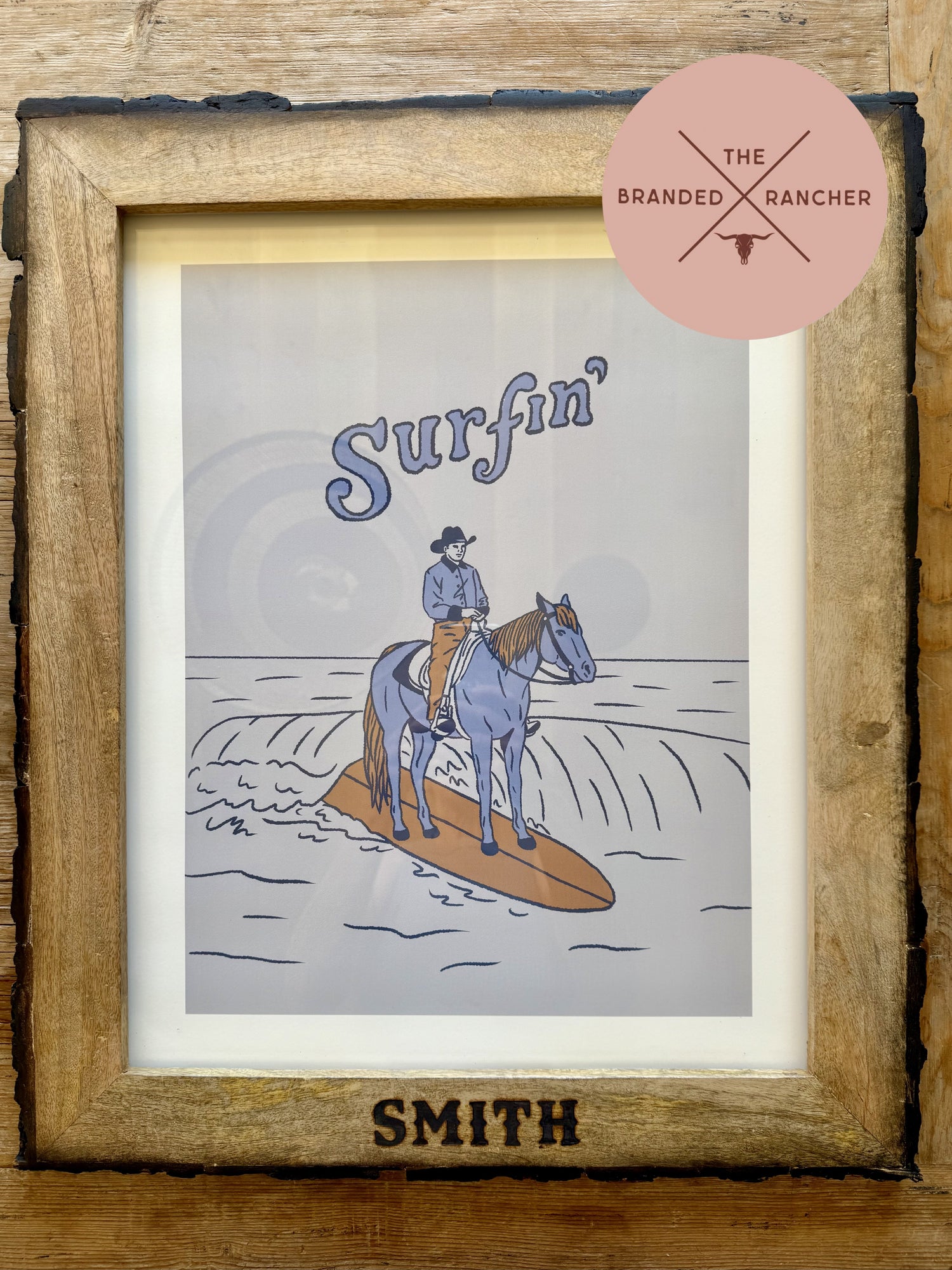 Created as a one-of-a-kind wedding gift, this commissioned art piece shown in the photo is sized at 20" x 24" and celebrates the Smith couple’s shared passions for surfing and horseback riding. We struck gold with this one! Please inquire for details on commissioned pieces.